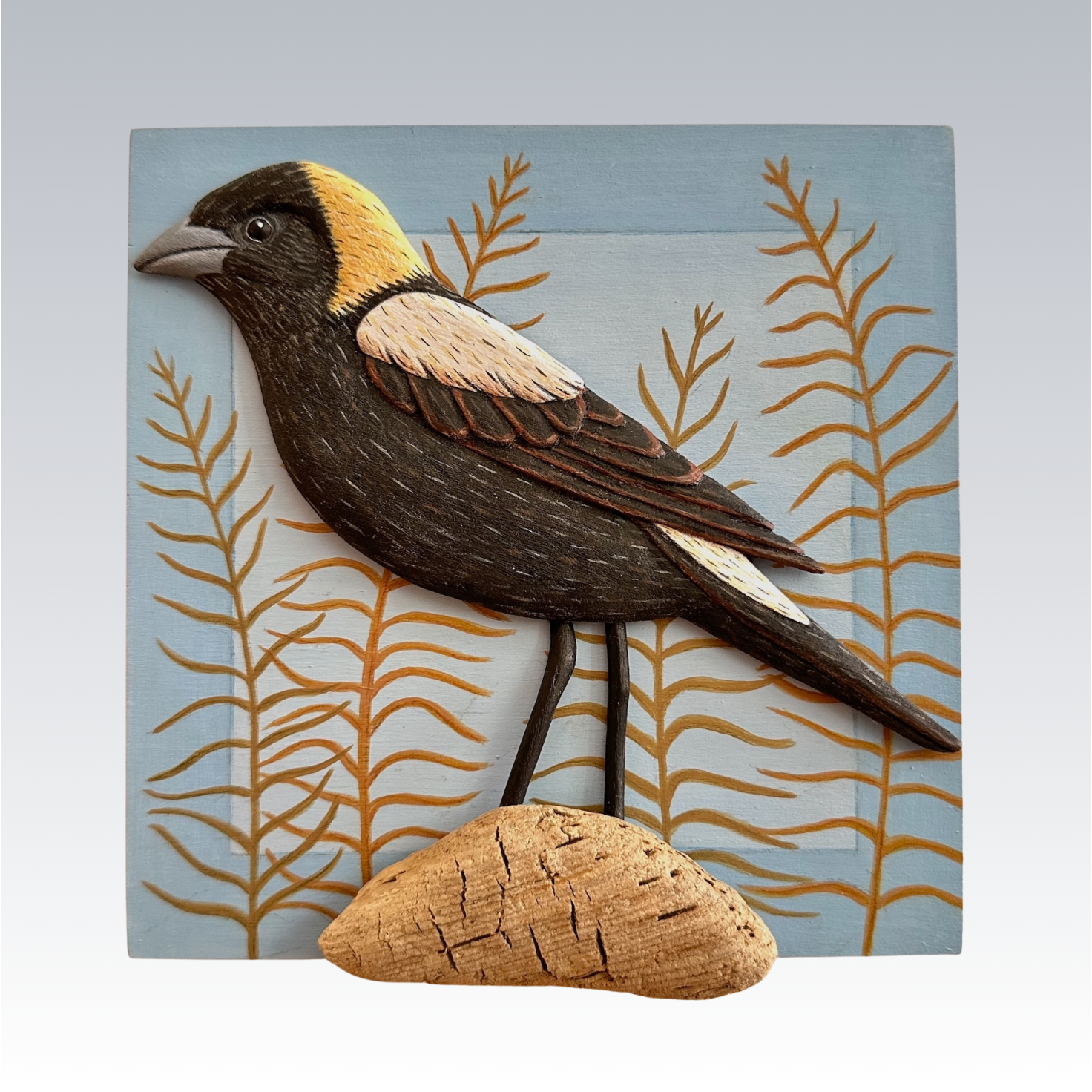 Bobolink Posted March 18, 2026 by Lynne Bobolink Cradled birch panel, various woods, acrylic 6H x 6W x 1L $325