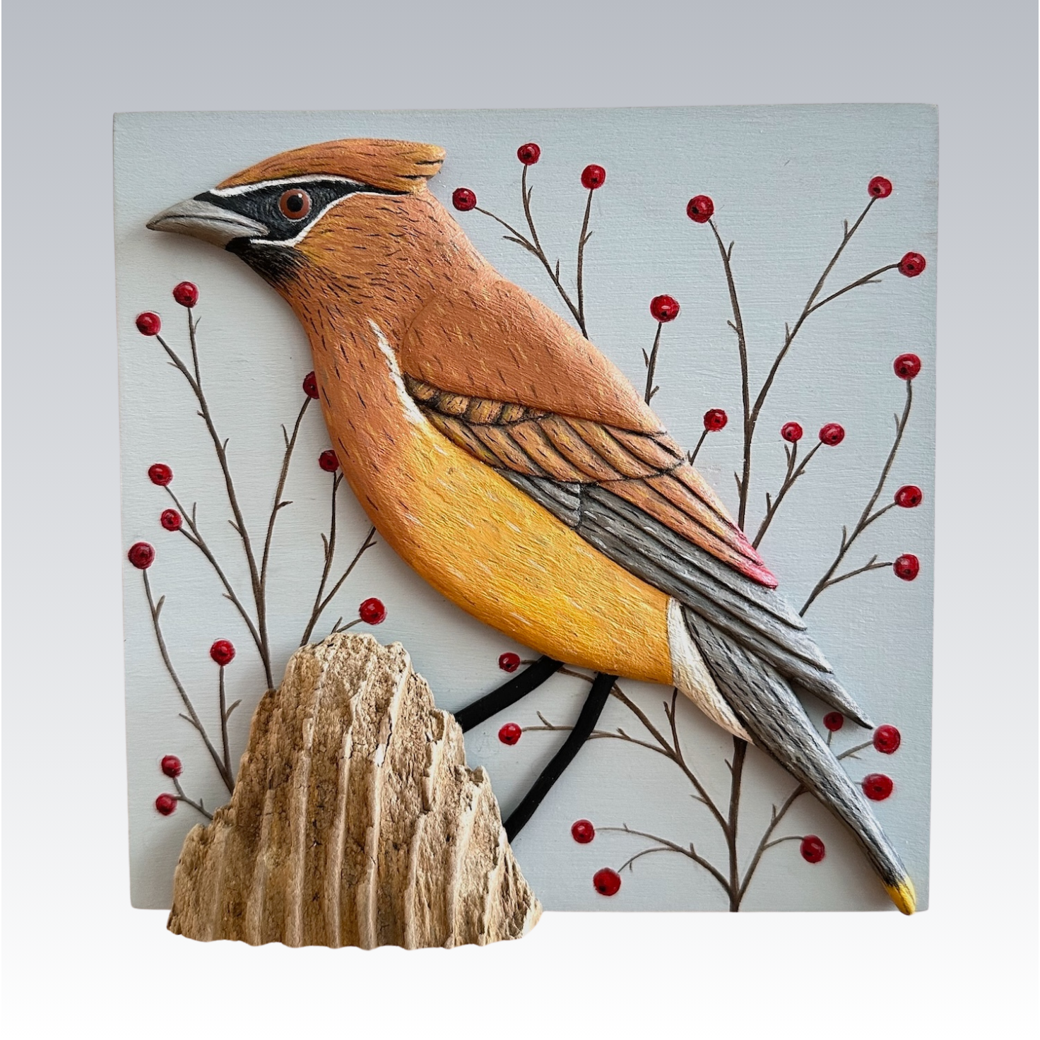 Cedar Waxwing with Berries Posted March 18, 2026 by Lynne Cedar Waxwing with Berries Cradled birch panel, various woods, acrylic 6H x 6W x 1L $325