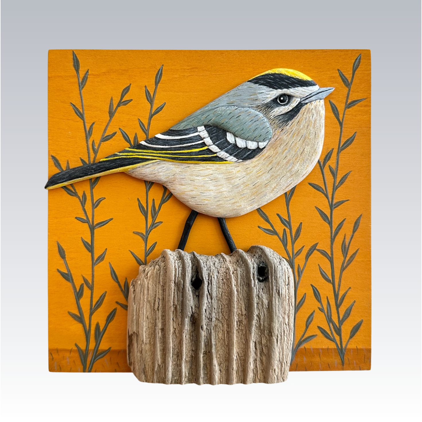 Golden-crowned Kinglet Posted March 18, 2026 by Lynne Golden-crowned Kinglet Cradled birch panel, various woods, acrylic 6H x 6W x 1L $325