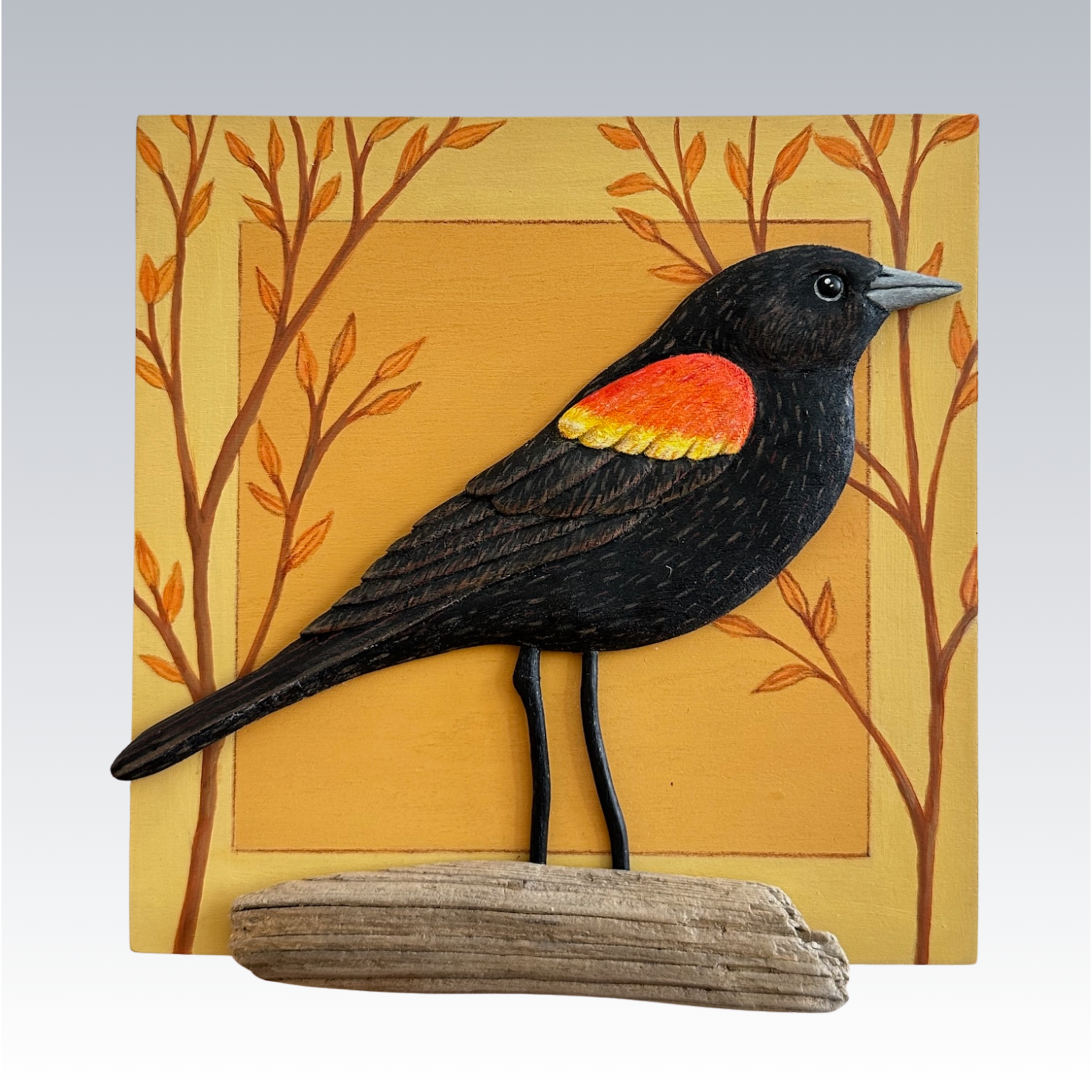 Red-winged Blackbird Posted March 18, 2026 by Lynne Red-winged Blackbird Cradled birch panel, various woods, acrylic 6H x 6W x 1L $325